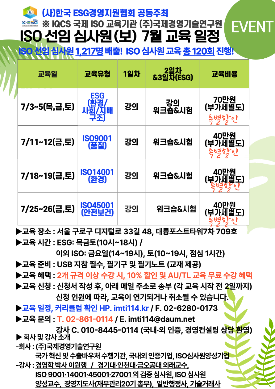 (ÁÖ)±¹Á¦°æ¿µ±â¼ú¿¬±¸¿ø ÀÔ´Ï´Ù!7¿ù ISO ¼±ÀÓ½É»ç¿ø(º¸) ±³À° ÀÏÁ¤ ¾È³»µå¸³´Ï´Ù.(»ç)ESG°æ¿µÁö¿øÇùȸ¿Í °øµ¿ÁÖÃÖÇÏ¿© ÁøÇàÇÏ´Ï